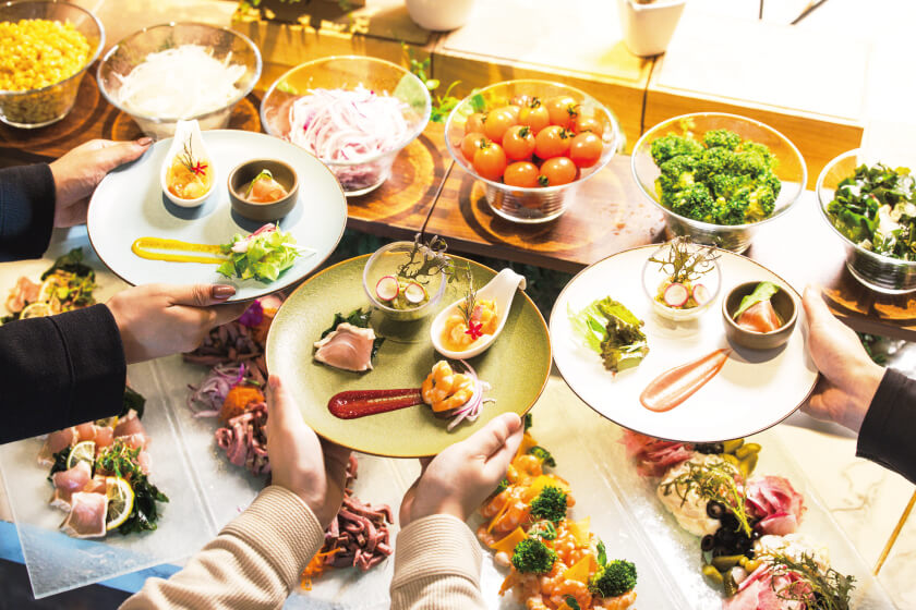 前菜、サラダ、本日のスープ、パン、デザート、ソフトドリンクはビュッフェにてお楽しみいただけます。
