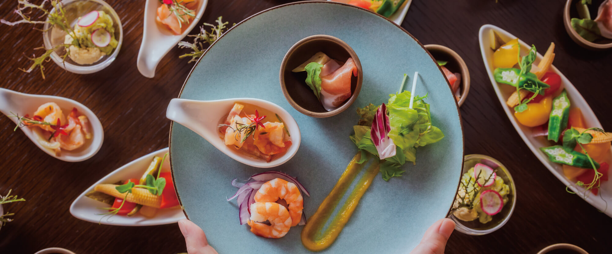 前菜、サラダ、スープ、パン、デザート、ソフトドリンクはお好きなだけ楽しめるビュッフェでご提供。