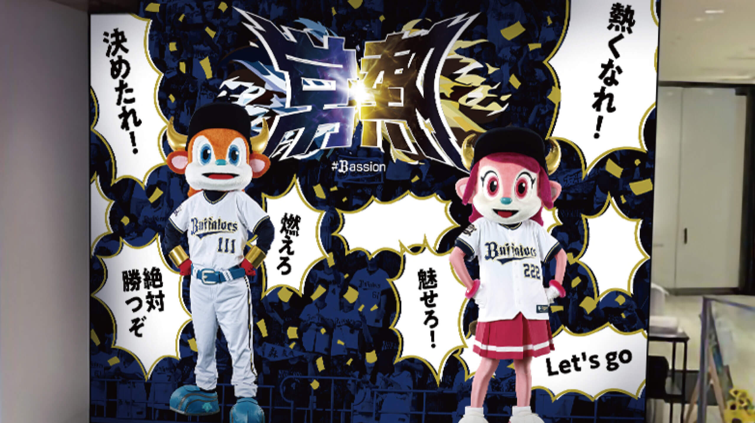 オリックス・バファローズの2025年キャッチフレーズ「常熱(じょうねつ)」をテーマに球団公式マスコットの バファローブル&ベル と一緒に、熱い応援を表現できる撮影スポットをご用意しました。